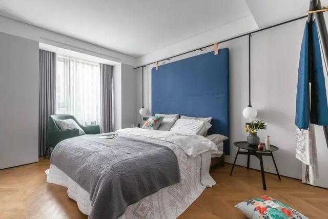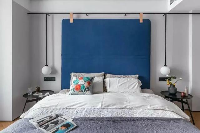 ▲卧室墙面在浅灰色的基础,床头墙上装上一个蓝色的靠背,上方黑色的线管基础,在床头两侧垂下球形吊灯,为空间带来一种小资优雅的文艺体验。