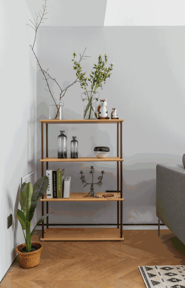 ▲沙发茶几区域铺上白色带灰纹的地毯,灰色沙发墙基础布置一张灰色布艺沙发,两侧加入绿植与展示架的装饰,也让空间显得清新优雅而活力高级。