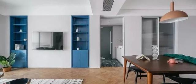 ▲没用电视柜的电视墙刷成灰色的墙面,中间壁挂安装电视机,两侧加入蓝色的入墙式收纳展示柜,蓝色柜体是底部带门+顶部开放的设计,摆上白色陶艺品与书籍,也让空间显得洁净而又自然。