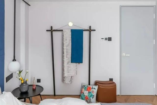 ▲床侧边摆一个衣帽架、一张棕色皮凳,衣帽间上可以挂靠衣物,提供方便的临时收纳体验。