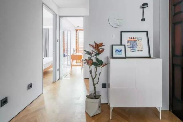▲玄关布置一个小矮柜,柜台上摆上装饰画,墙身上还有壁灯与圆形的装饰,一旁放置一盆橡皮树,一进门就是一个文艺精致的空间,带来一种清新优雅的氛围体验。