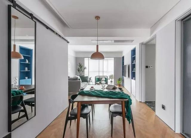 ▲餐厅在简洁灰色的墙面基础,装上一面镜子谷仓门,搭配原木餐桌椅组合,带来一个灵活轻松的用餐氛围。谷仓门挡住了电箱,同时也可以照亮空间,并为玄关提供一个整理仪容的全身镜功能。