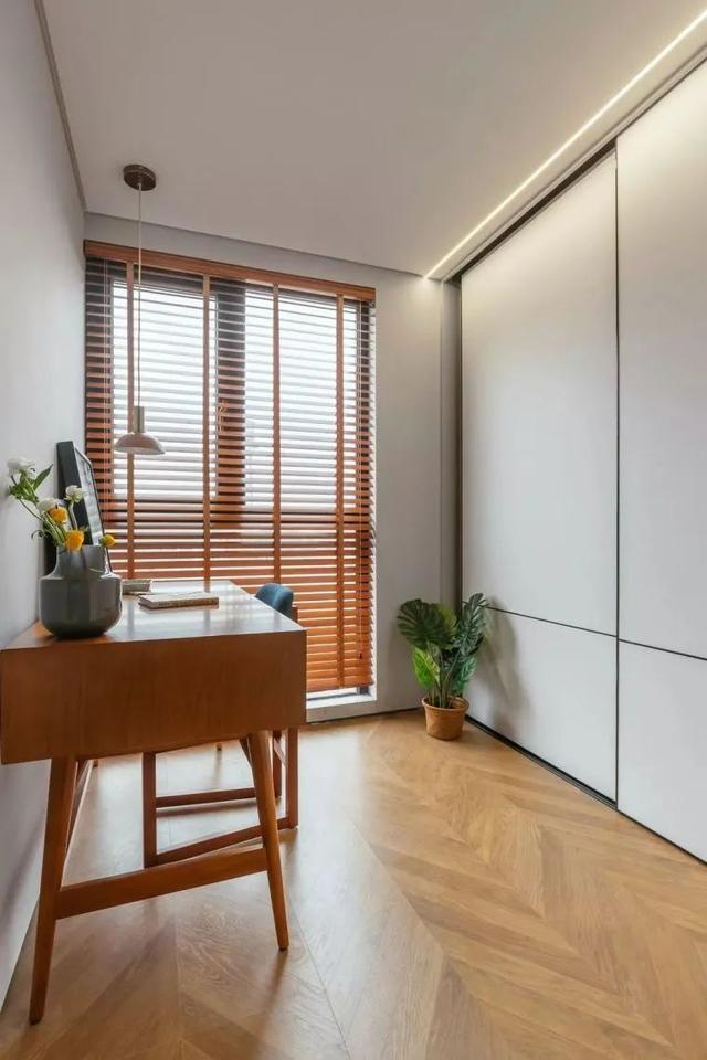 ▲书房在木地板、木质百叶帘与木质书桌椅的搭配下,结合绿植盆栽的点缀,营造出一种自然清新的空间氛围。