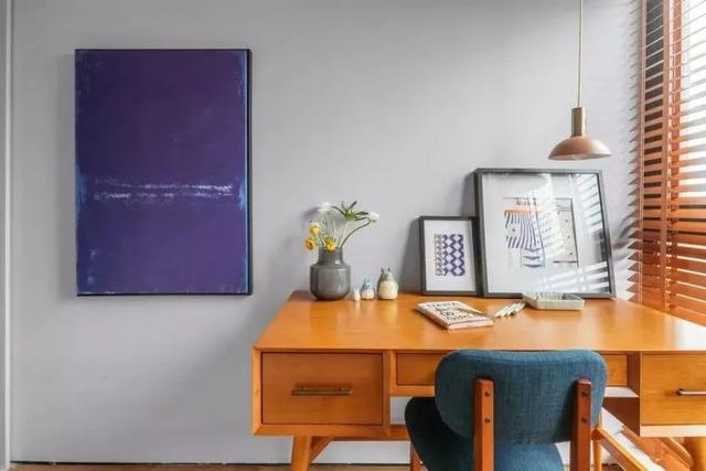 ▲书桌前的墙面挂一幅紫色装饰画,光线透过百叶帘进入空间,结合台面上的花瓶与装饰画,为主人营造出一个简雅舒适的工作氛围。