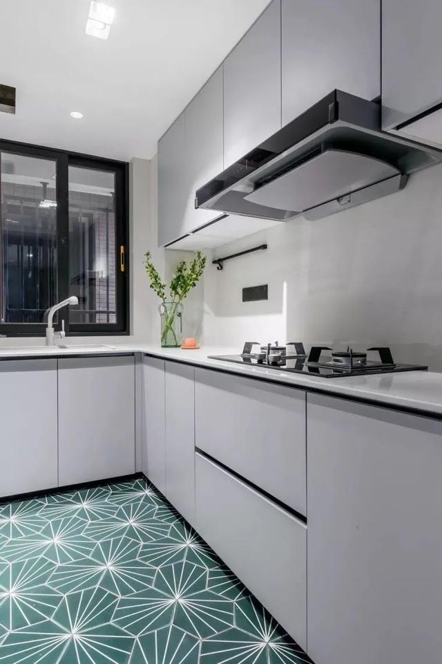 ▲厨房地面也是青色的几何图案花砖为基础,装饰简洁的白色橱柜,实用宽松的操作台,也让做饭更加轻松舒适而顺手。