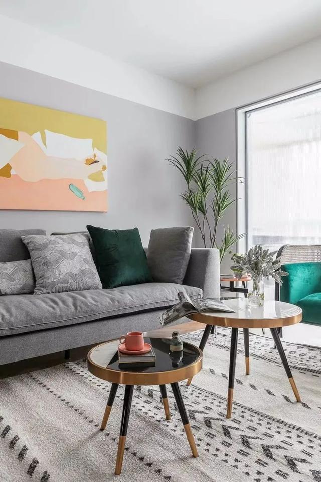 ▲圆形茶几以金属+石材质感的双拼组合,搭配一张绿色休闲椅,角落位置的绿植盆栽点缀,也让整个空间显得文艺优雅而清新精致。