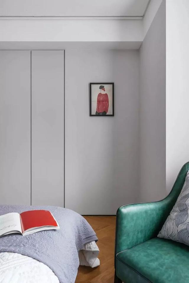 ▲床尾定制简洁的衣柜,墙面挂一幅装饰画,靠窗位置摆一张绿色皮艺休闲沙发椅,也让生活显得更加低调端庄而舒适。