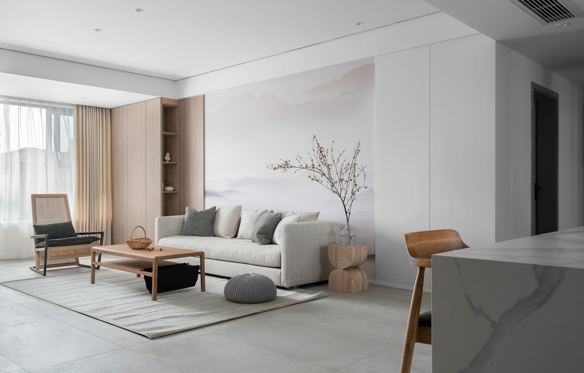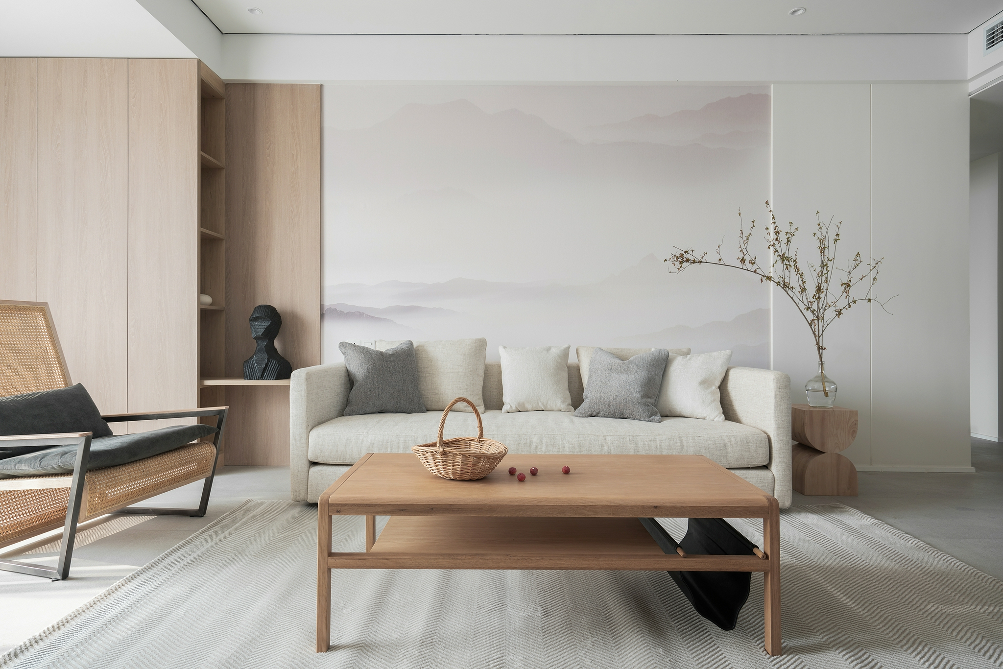 米白色沙发端坐正中,布艺的触感温柔贴心。一幅远山的背景画意境悠远,搭配花艺自成一体的造型,相得益彰。木质双层茶几将极简的风格彰显到了极致,简单实用是其内涵。