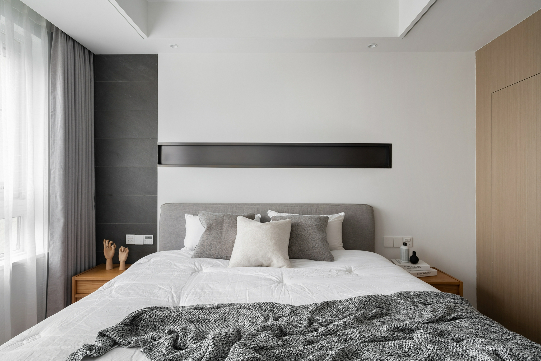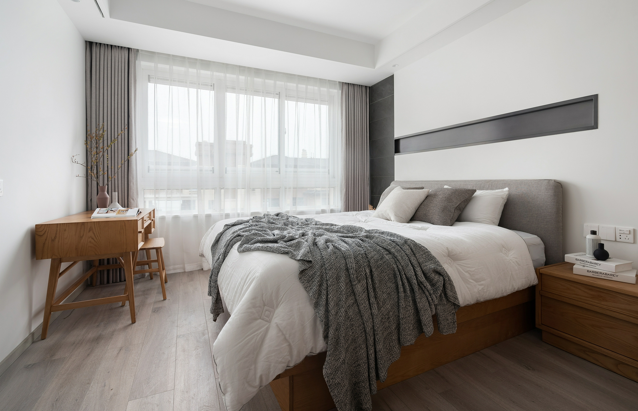 干净的素白墙面,深木色的床与边柜加以点缀,中和了白色的轻盈。棉麻感的窗帘和床品呼应,柔和了白色的单调。房间角落的桌面与衣柜做了融合,添上一张椅,又多了一处安静的独处空间。