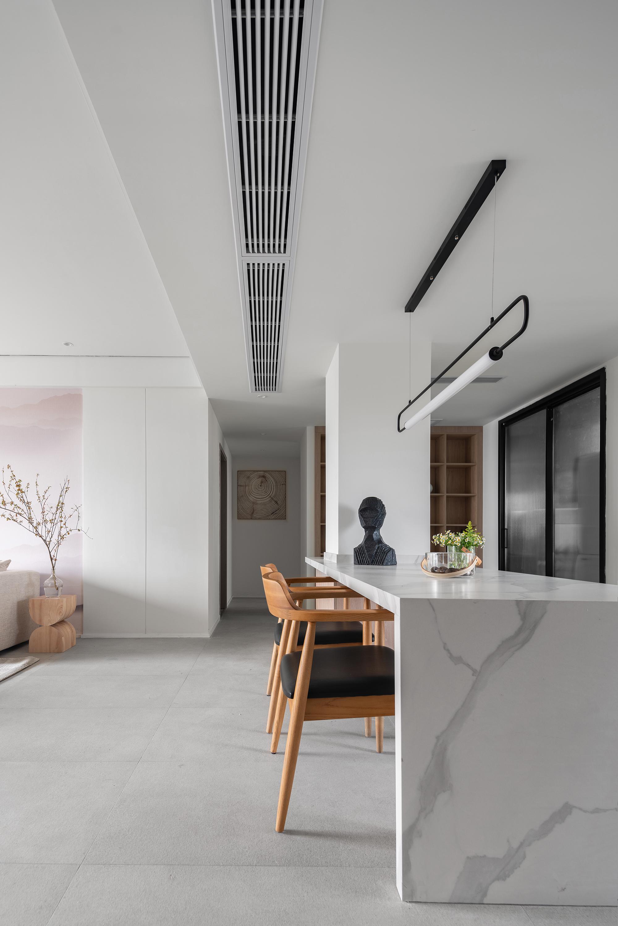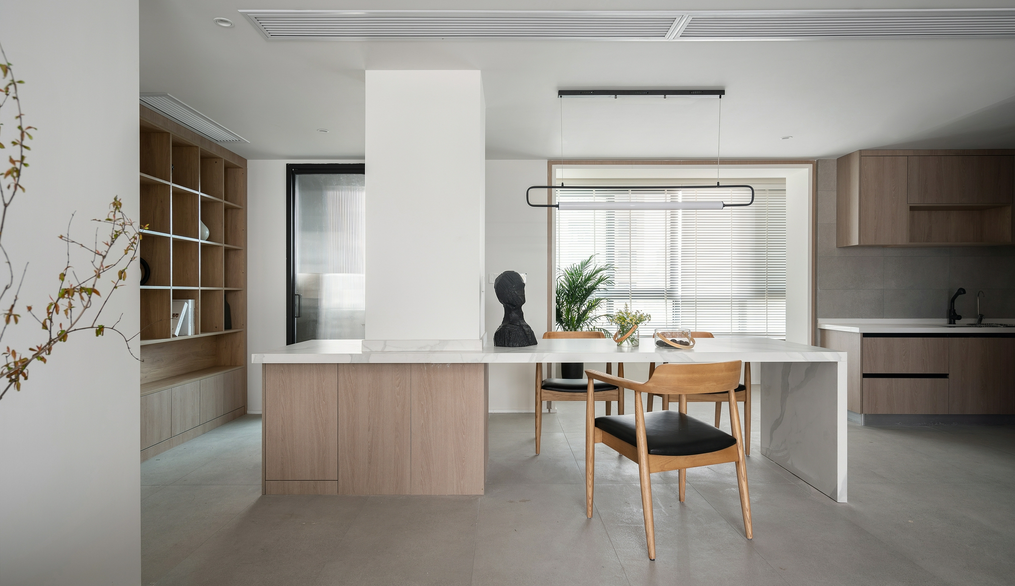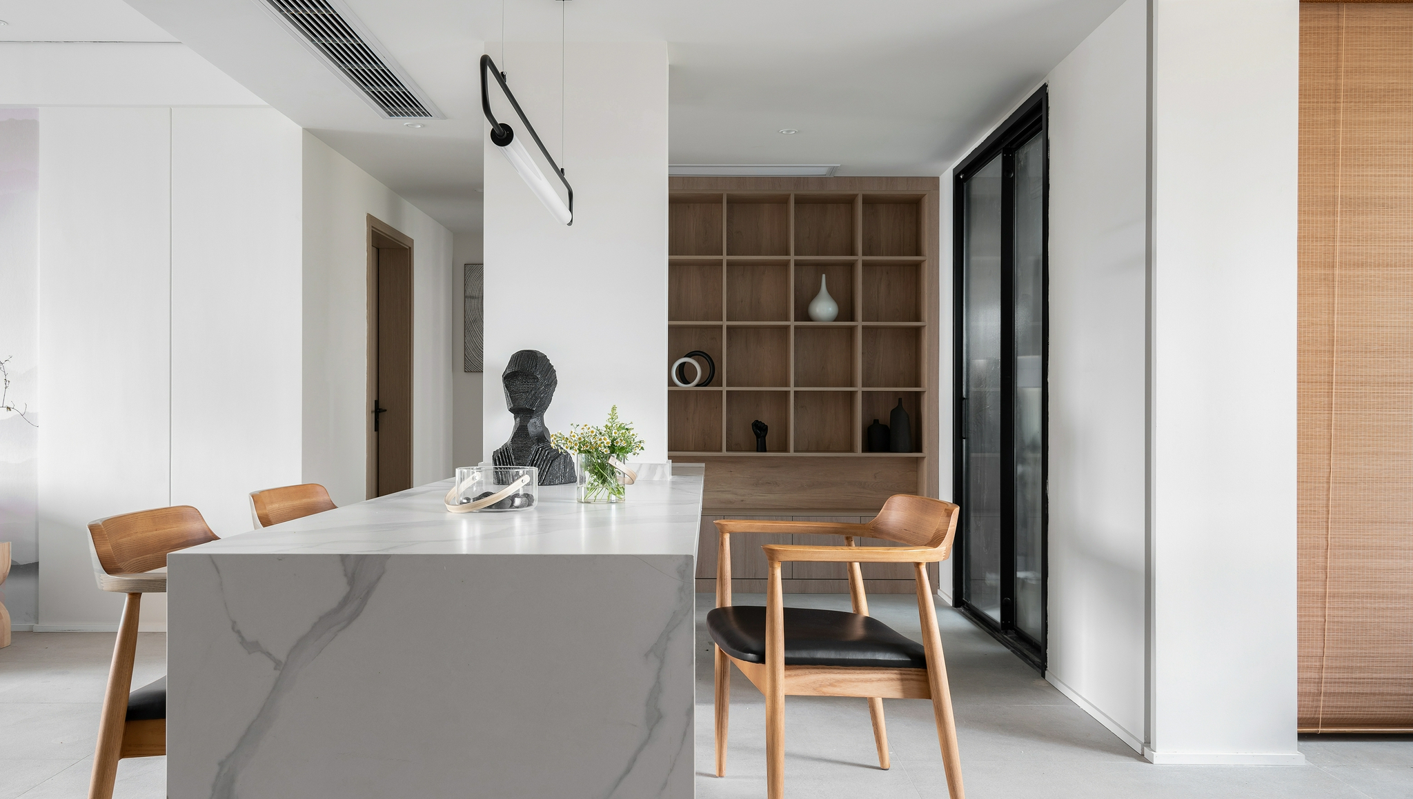 餐厅位于公共区域的中间位置,起着承上启下的作用,厨房制作的美食可以随手端上餐桌,同时可以和客厅进行无缝对接,一切尽在默契中。岩板台面沿墙展开,搭配中式木质餐椅,简单明亮的空间,给闲适的下午时光,温情的晚间时刻提供了生活化的场景。