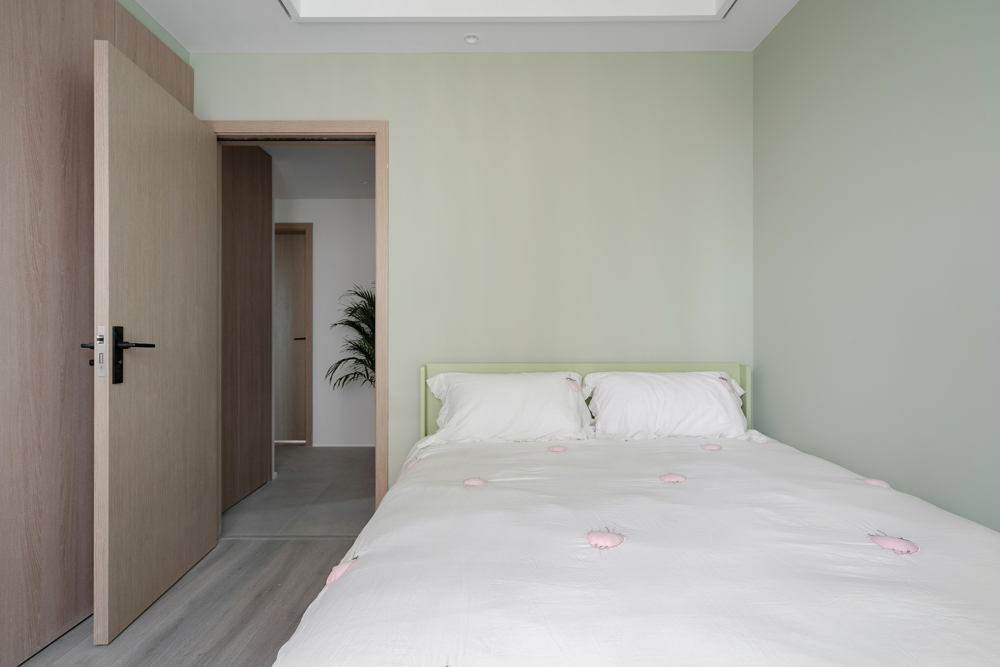 次卧以草绿为主色,清新淡雅的空间让居住者犹如身处大自然中一般,自在舒心的感受油然而生,明亮的阳光洒落,让房间绽放光彩。