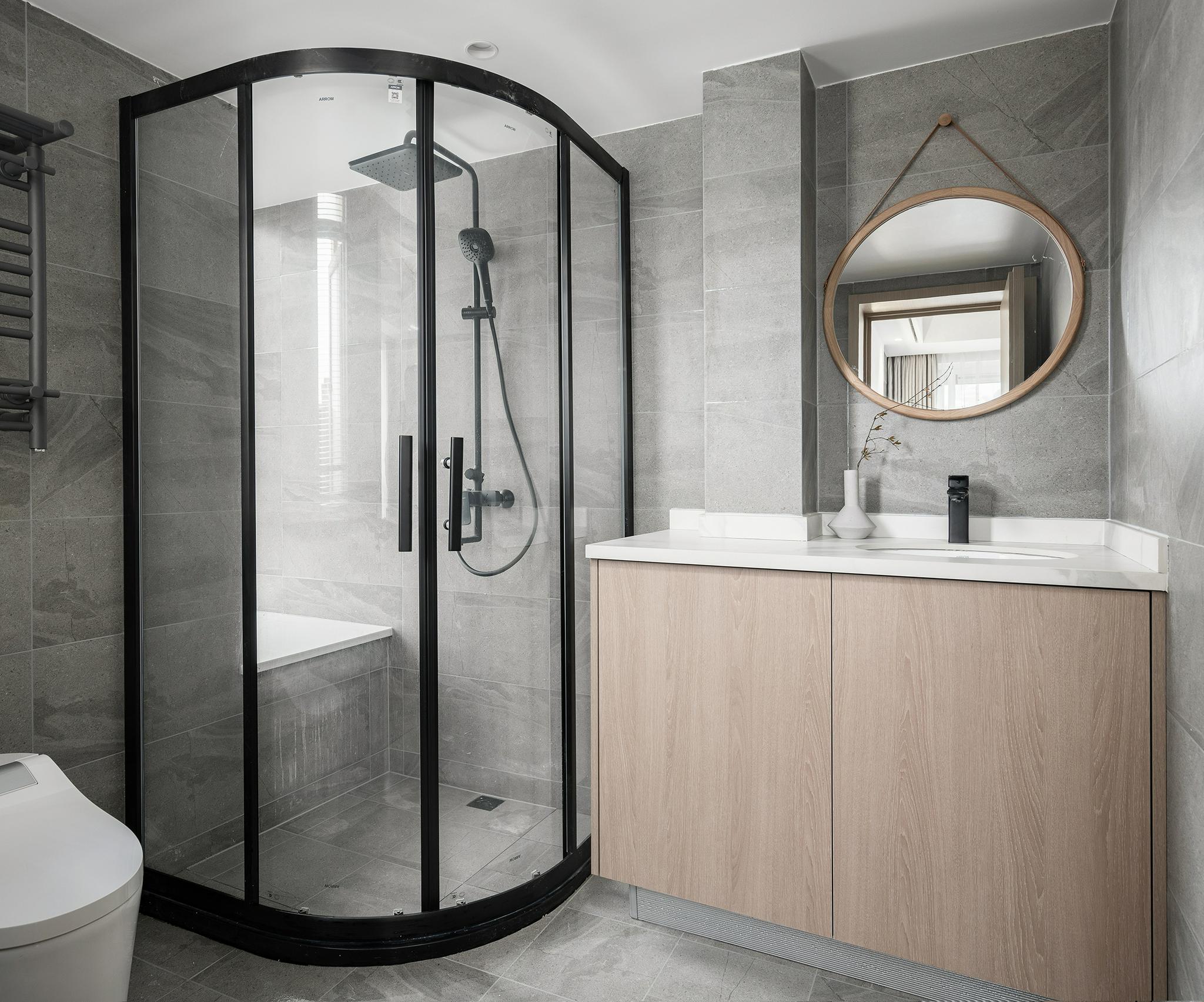 圆镜,弧形浴室,方正的收纳柜,不同形状在空间中演绎着自己的风采。干与湿的结合,使卫生空间的利用率提升,方便了日常生活的需要。