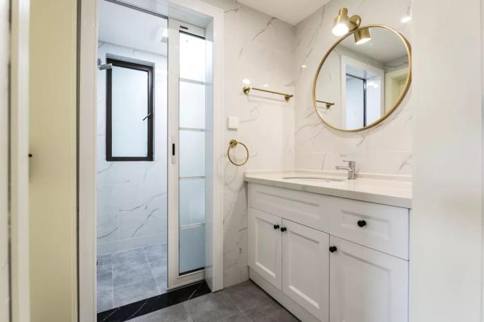 ▲卫生间以白色大理石质感墙面,搭配简约灰色调的地面,整体白色的洗手盆柜,搭配一个圆形的金属框镜子,整体显得优雅精致而档次。