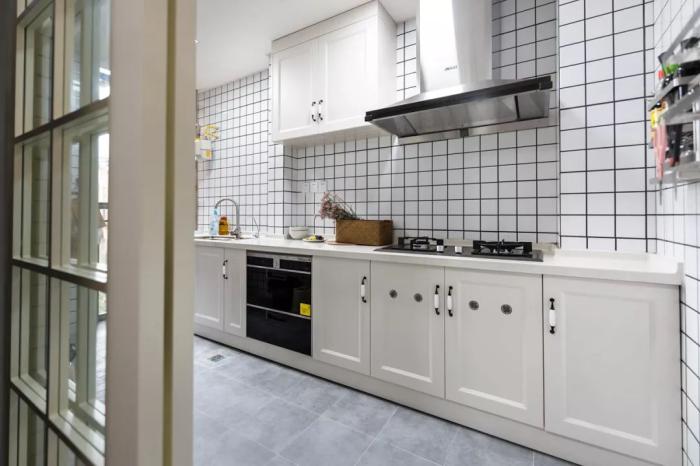 ▲厨房以浅灰地砖+白色小砖墙面,一字型的操作台,雅白的橱柜,在侧边的墙面还加入了实用的厨具纳架,整体空间简洁而又文艺实用。