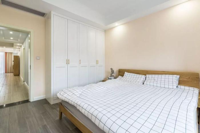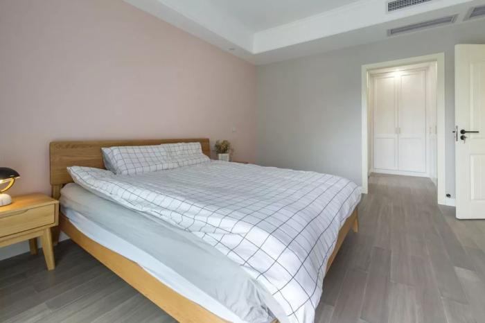 ▲主卧床头墙是淡粉色的,侧边墙面则是浅灰色,搭配木质床与简约的床单,整个空间充满了舒适自然的气息。