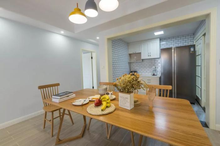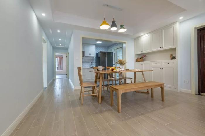 ▲餐厅在大门旁边,餐边柜与鞋柜组合的定制柜,简洁的元木质餐桌,让餐厅自然清新好惬意。