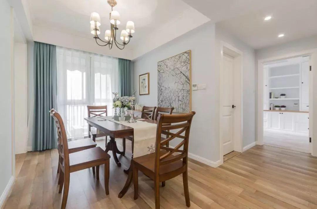 ▲餐厅淡蓝色的墙面挂上一幅大装饰画,搭配上一套实木的餐桌椅,简简单单的空间,给人以淡雅的温馨感。