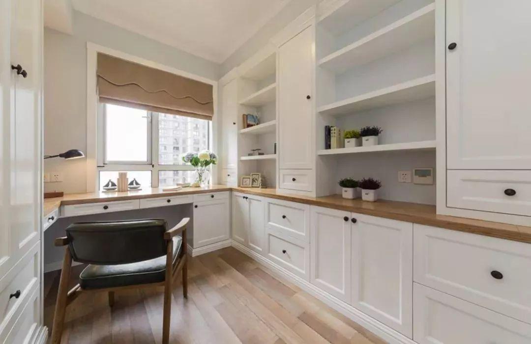 ▲书房靠窗布置书桌,两侧被定制的柜体包围,白色柜门+木色的桌面,结合木色地板与棕色窗帘,营造出一个优雅自然的空间质感。