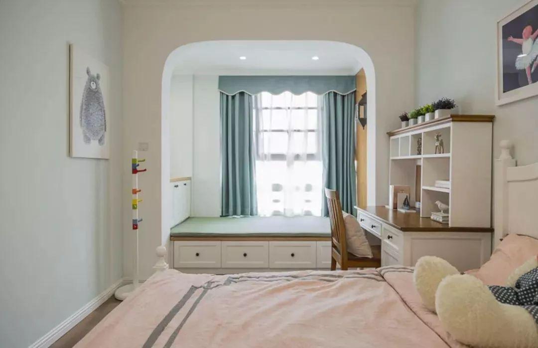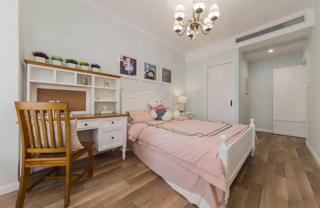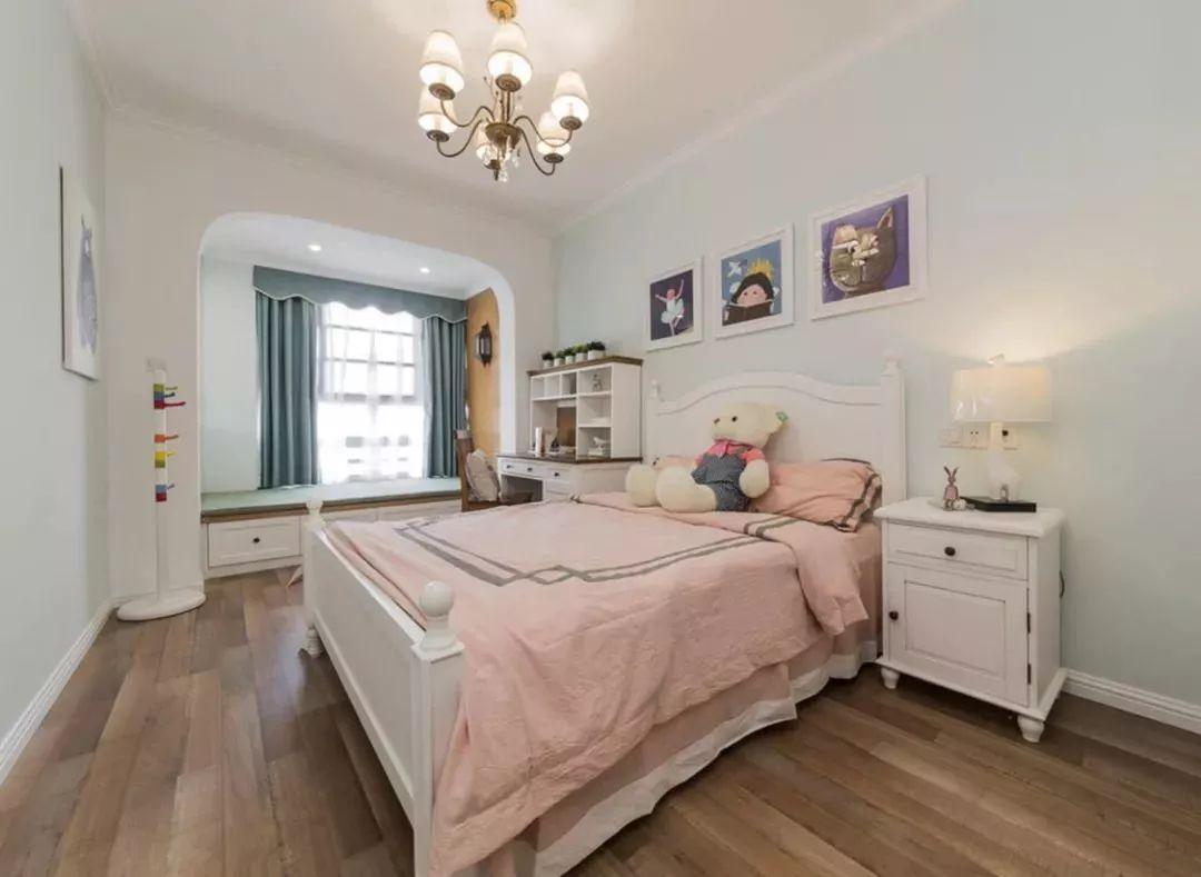 ▲儿童房在淡蓝色的墙面基础,搭配上白色床与柜体,结合一床粉色床单,带来了一个现代优雅的浪漫温馨氛围感。
