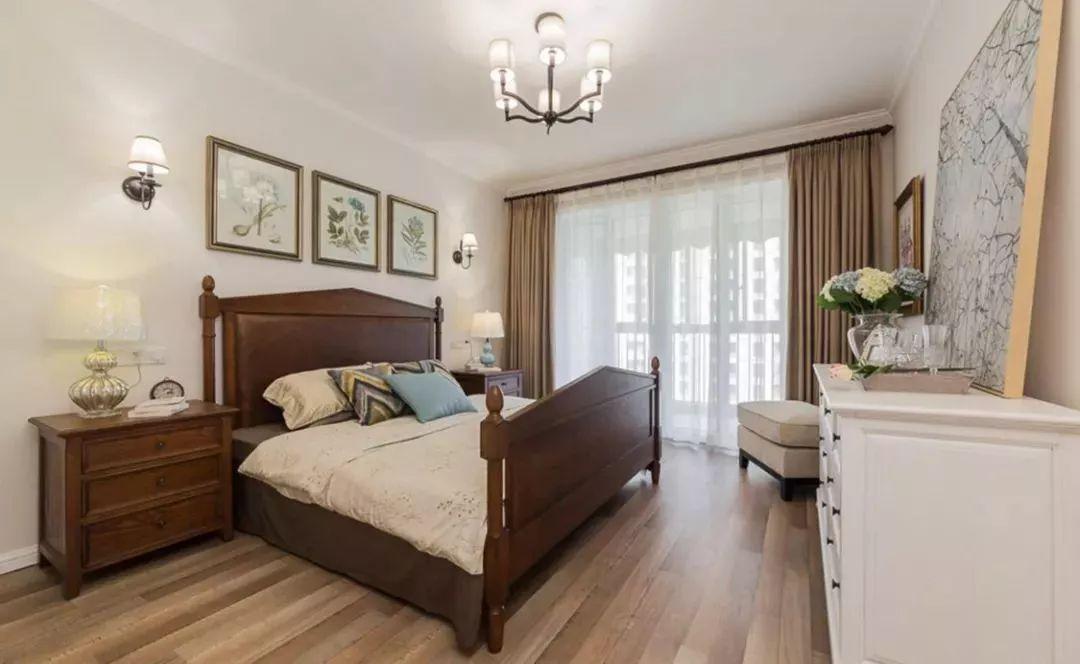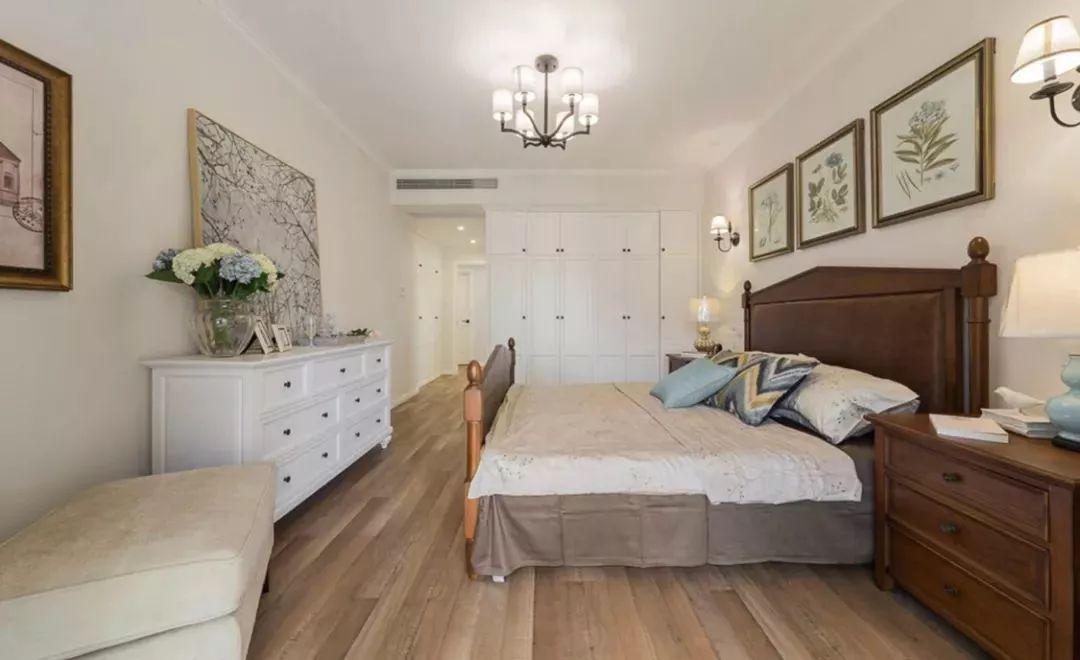 ▲主卧在深浅搭配的木地板基础下,整体简约大方的墙面天花,床头三幅正方形的植物装饰画,结合美式床,以软装为主营造出一个精致端庄的氛围。