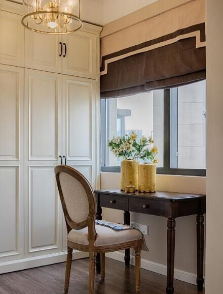 对着窗户摆上棕色小书桌,打造一个简易的小书房,工作累了可以看着外面的风景,能缓解工作压力。