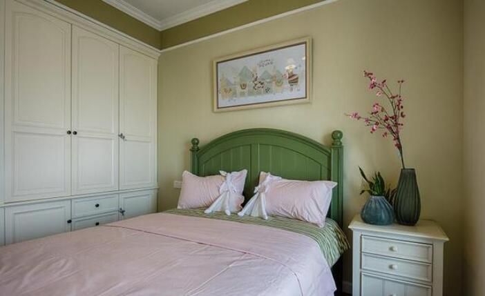 次卧,素雅温馨的墙纸作为背景装饰,然后以绿色清新色彩点缀营造出层次感,色彩氛围更轻松。