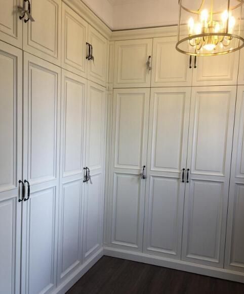 打造了两排到顶的转角大衣柜,两夫妻的衣物再多也可以收纳的下,还可以把衣物好好的分类起来。