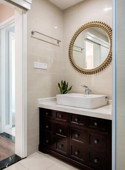 卫生间的洗手台外置,以棕色柜面,白色灶台和暖色墙面营造出空间的利落清爽。