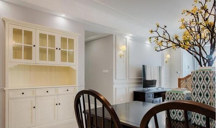 餐厅的过道墙装上了象牙白的餐边柜,可以收纳高档有品位的酒,中间布置上装饰品,都会显得很好看。