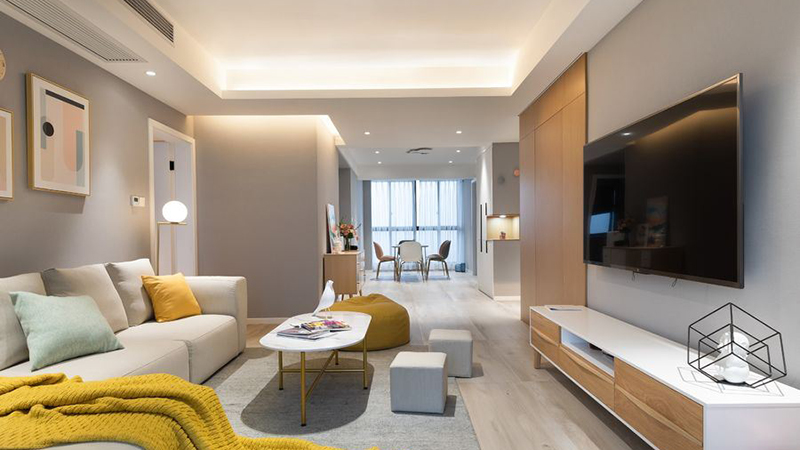 这是一套80平米的小户型装修案例,装修的非常时尚漂亮,造造觉得尤其是背景墙,设计的非常个性时尚,很是值得借鉴学习。室内墙壁上采用高级灰色的格调,搭配浅色的实木地板装饰,显得非常时尚有质感。