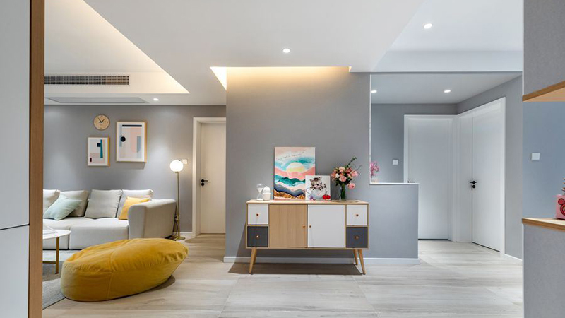 设计师在正对门口的位置设计了一面背景墙,背景墙也是采用高级灰色的格调,搭配浅色的实木柜子,在柜子上摆放一些壁画和装饰品,使得室内显得非常文艺时尚,大大提升了室内的档次感和舒适度。室内墙壁上采用高级灰色的格调,与白色的屋顶非常好的搭配在一起,显得非常时尚有层次感。