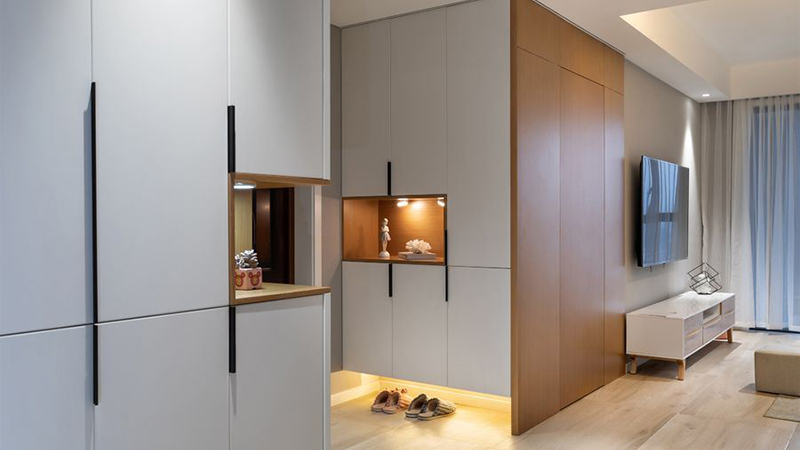 在室内墙壁上采用打柜的方式,白色的柜子采用入墙式的安装方式,与高级灰色的墙壁非常好的搭配在一起,显得非常时尚有层次感,丰富的储物格设计能够将室内的物品很好的收纳起来,在中间的隔板上还能摆放一些装饰品,使得室内显得更加文艺时尚。