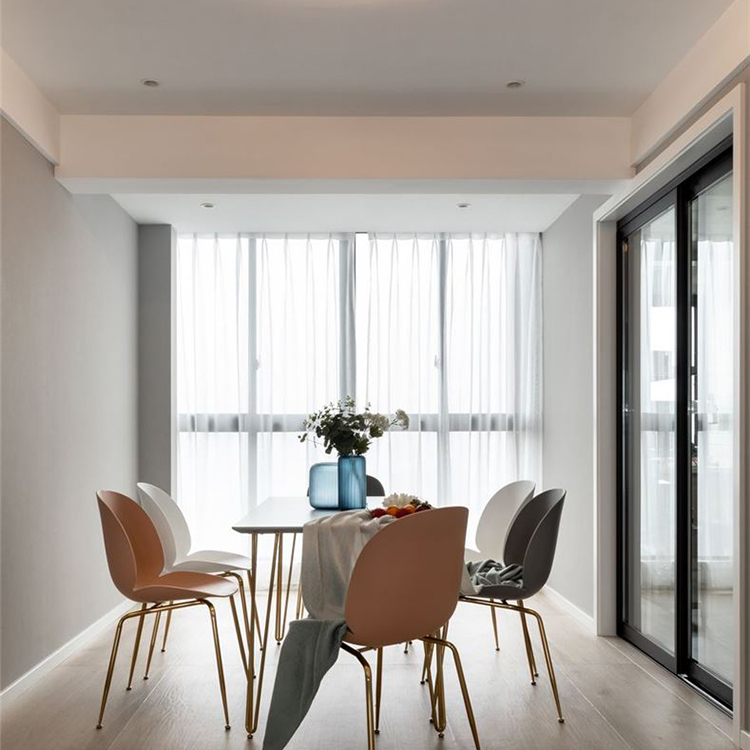 餐厅有着一面大尺寸的窗户,使得这里有着非常好的采光效果,餐桌非常精致漂亮,搭配几把舒适的椅子,一家人吃饭用餐感觉非常惬意舒适。在餐桌上摆放一些鲜花点缀,营造出一种温馨浪漫的用餐环境。