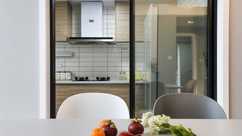 餐厅与厨房之间利用玻璃推拉门隔开,这样既不影响室内的空间感,同时也能防止油烟进入室内,方便日常卫生的打理。浅色的实木橱柜呈L型摆放安装,与白色的墙壁非常好的搭配在一起,显得非常时尚有质感,搭配一组精致的吊柜,能够将厨房的物品分门别类的收纳起来。