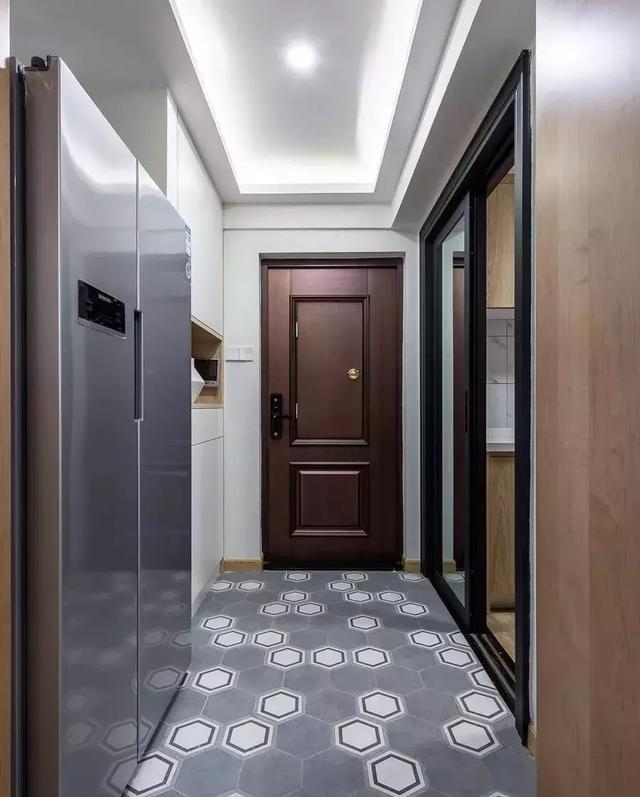 玄关设计了通顶鞋柜,满足入户收纳的需求。同时考虑厨房操作空间的不足,玄关柜未做满,留出冰箱位。冰箱放在这里,离厨房和餐厅都近,使用起来更方便。