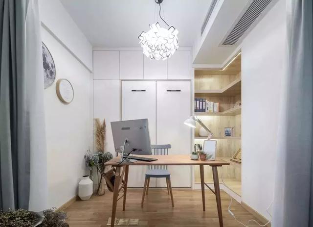 将原餐厅位置改做书房,书柜上的设计更是把成墨菲床与储物柜书柜三者结合到一体,丰富的空间的收纳,也实现了空间多功能的实用性。