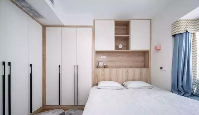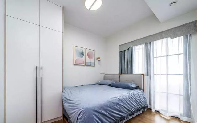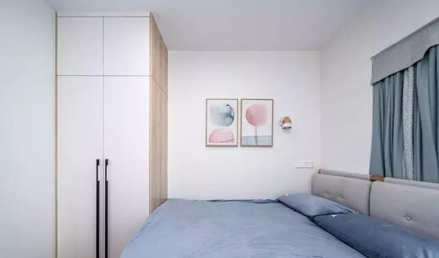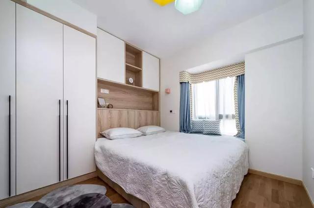 主卧仍是以白色原木色为主色,为避免空间的单调性,选择了黄色和蓝色搭配的窗帘,自然清新的卧室空间,更加有利于营造舒适的睡眠环境。