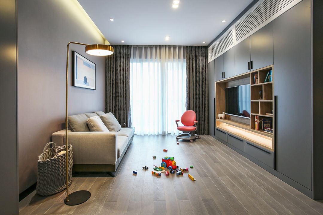 客厅的电视背景墙则是被利用起来做了收纳,整墙的柜子留空电视周边的部分区域,加上藏光之后使用更方便,看起来也更大气。