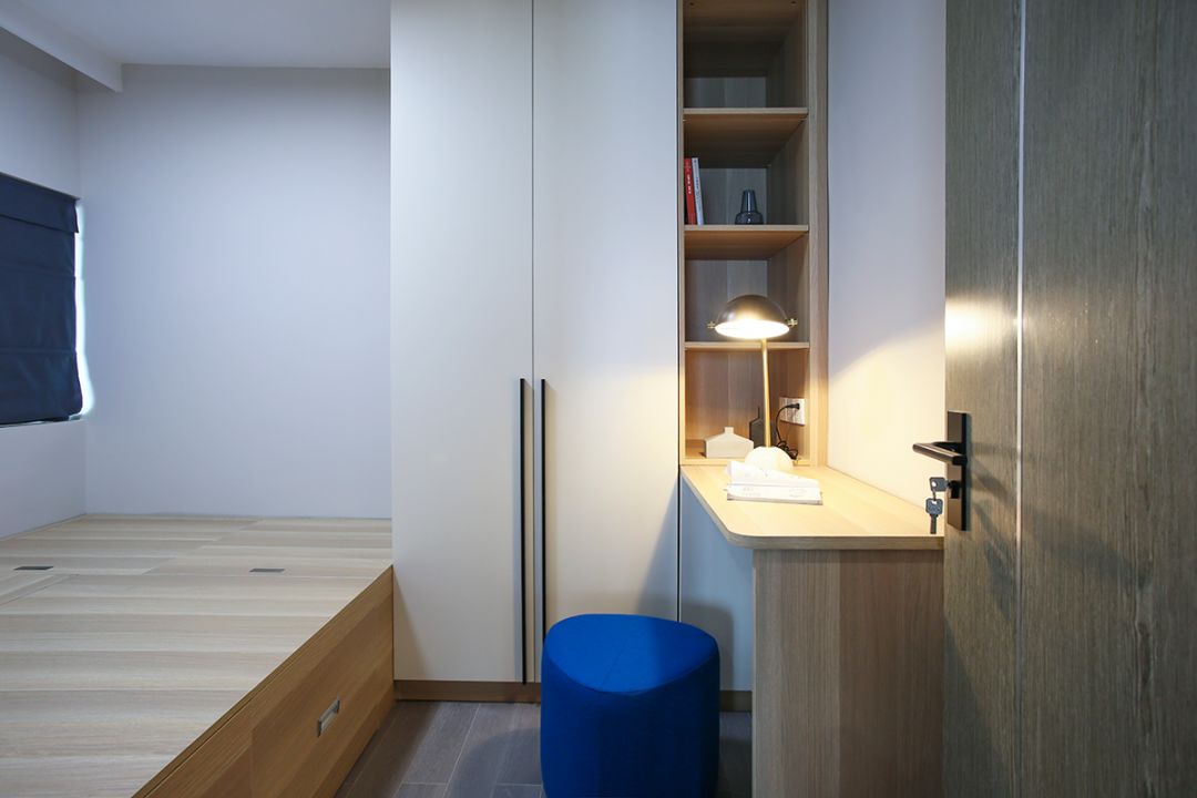 在主卧室里还有一个迷你的衣帽间,U字形布局的柜子把角落空间充分用上。衣帽间外的床头柜改成了梳妆台,使用起来更加方便。
