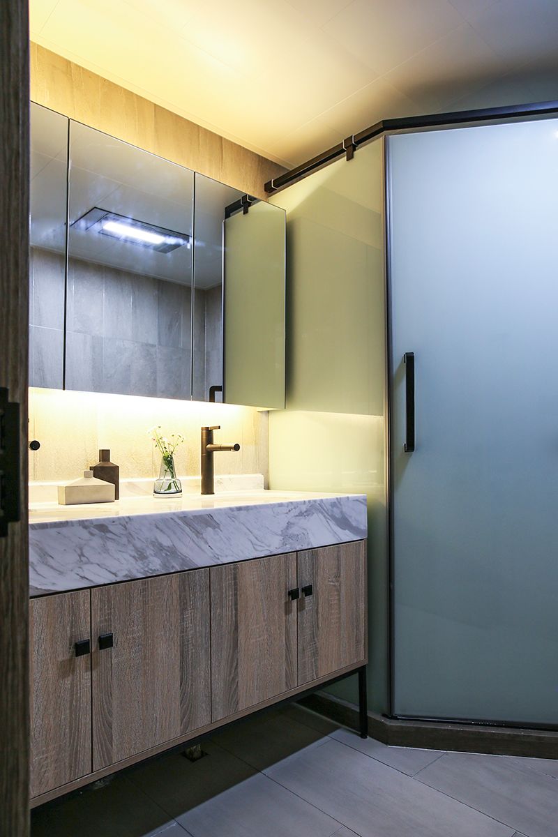 厨房内部的橱柜延续了客餐厅的柜子颜色,深灰色的大理石墙砖搭配灰色的哑光地砖,整个厨房看起来很有现代感。