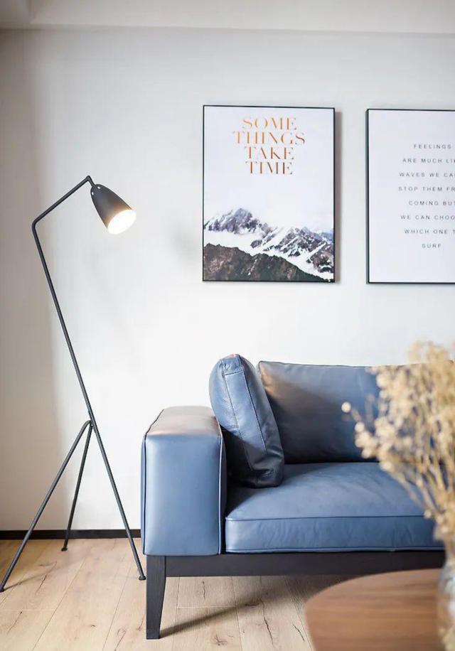 蓝色皮质沙发自带随性优雅的质感,黑色落地灯造型别致,线条感极强,背景墙选择组合挂画来丰富层次感,同时提升空间格调。