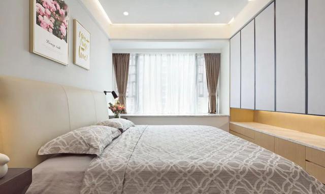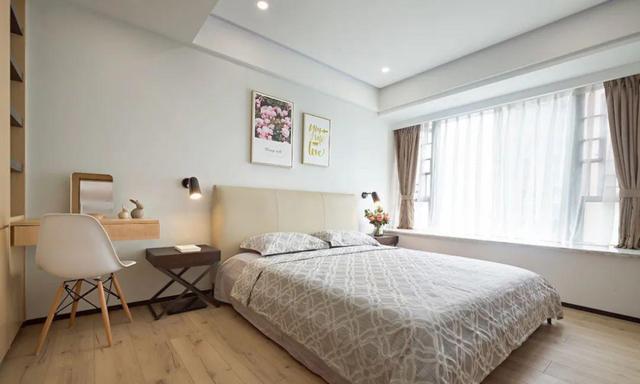 主卧风格清新雅致,扑面而来一份舒适感,梳妆台由左侧柜子延伸出来,实用又美观。