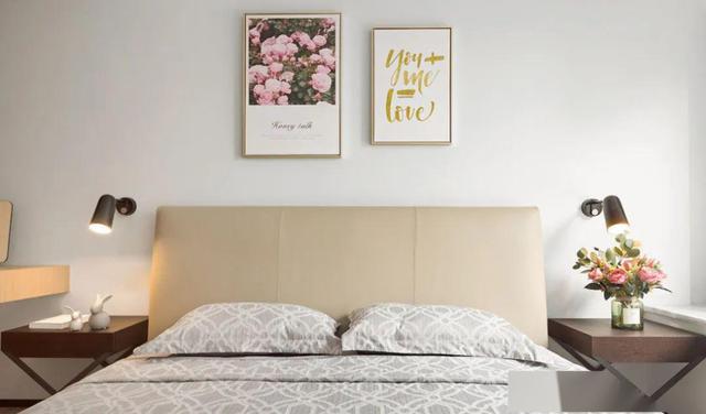 床头背景墙以两幅挂画装点,与右侧床头柜上,怡人的花朵呼应,清新与优雅兼具。