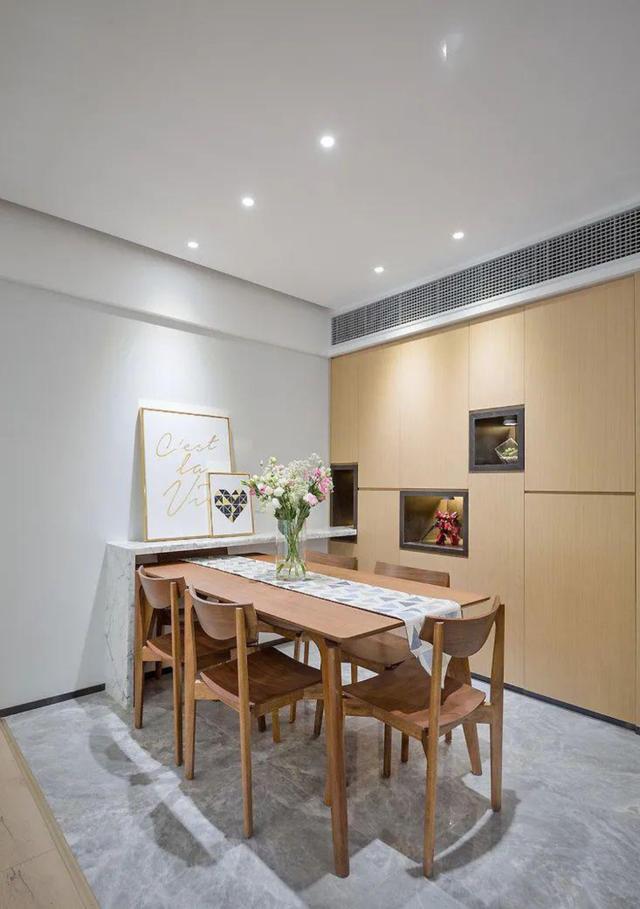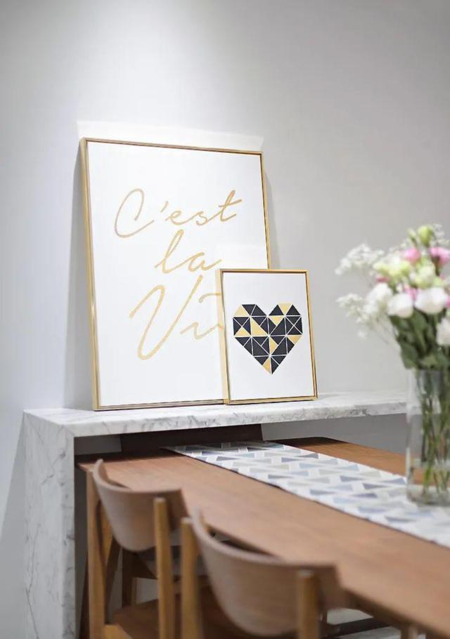 靠墙做了吧台设计,并一直延伸到餐边柜,吧台同样选择大理石,形成材质上的呼应,搭配精美的装饰画与清新的花束,气质满满。