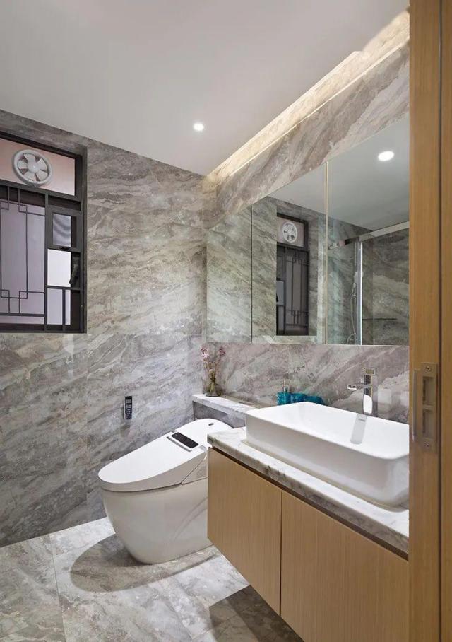卫生间墙面和地面,都是灰调的大理石瓷砖,木质浴室柜提高空间的温度,缓解灰色带来的清冷感。