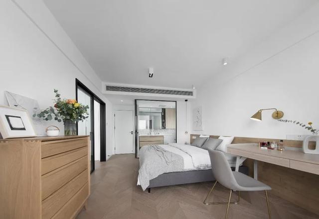 卧室空间宽敞,以纯白+原木为基调,辅以简约线条,打造宁静雅致的休憩氛围。