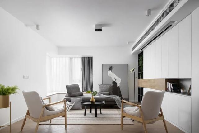 客厅做了收纳柜之后剩余空间无法安装电视,索性就直接取消电视安装投影取代传统电视墙,提升家的高级感。
