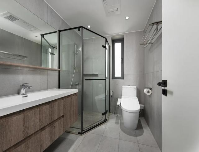 卫生间大镜柜+悬空浴室柜,解决收纳问题,还能扩大空间视觉效果,利用墙角的位置做了玻璃淋浴房设计,有效的隔离让整体空间保持干燥。