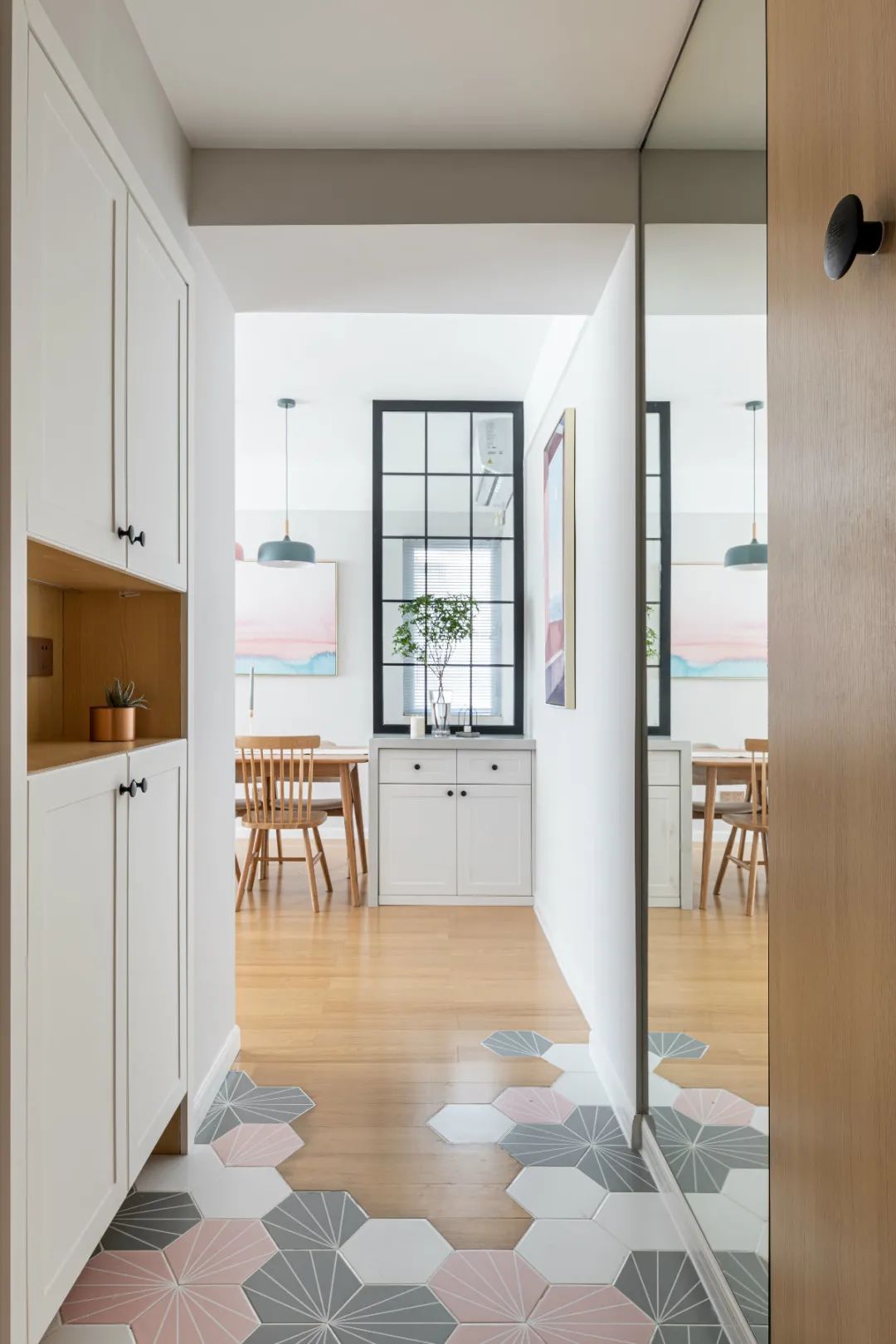 玄关,右手边的墙面上采用大面积镜子与左边鞋柜同宽,既可以扩大视觉效果也可以起到穿衣镜的效果。鞋柜下方留空设计,方便放置常穿的鞋子。