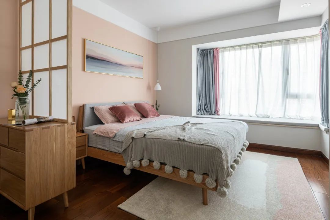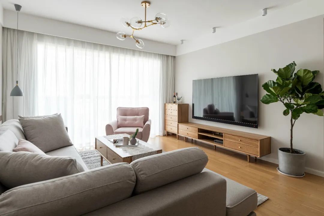 客餐厅以暖色墙面为主要背景基调,灰色布艺沙发呼应,原木实木电视柜与茶几同材质,与原木色地板一致,粉色挂画与单人沙发和抱枕作为点缀,淡淡的慵懒的也很莫兰迪!